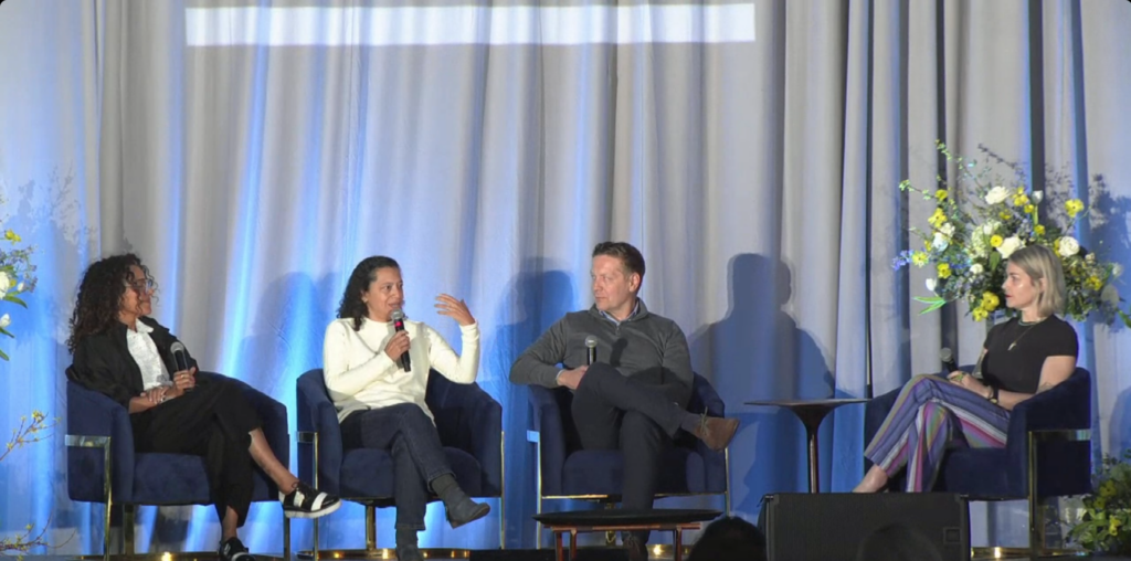 A panel featuring moderator Sarah Holdeman (The Impact Collective), Carolina Miranda (Cultivating Capital), Aurora Archer (The Opt-In), and Clay Brown (B Lab Global) followed. Entitled “The Future of the B Corp Movement & the New B Lab Standards as our North Star,” members spoke to the importance of using the B Lab Standards V2 as not just guidelines but also a springboard for building a collective movement. The ultimate goal is to spread benefits beyond the reach of a single company, benefiting everyone by transforming the way people do business.