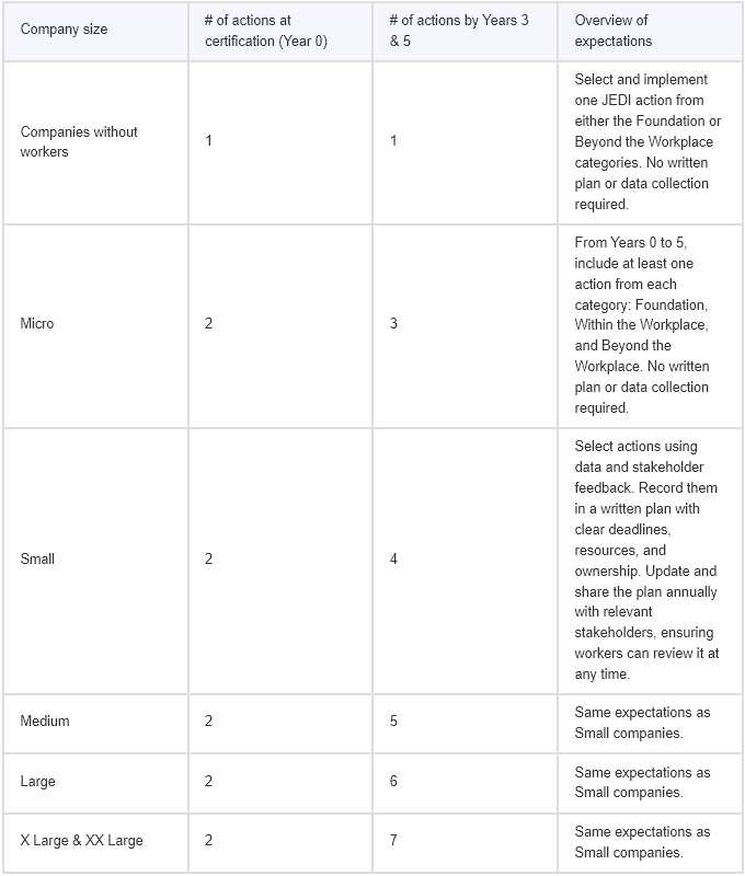The number and rigor of required JEDI actions increase with company size. Smaller companies focus on selecting and implementing actions, while larger ones are expected to use data and feedback, formalize their plans, and keep workers and stakeholders informed of progress. The table below outlines what’s required at each stage: