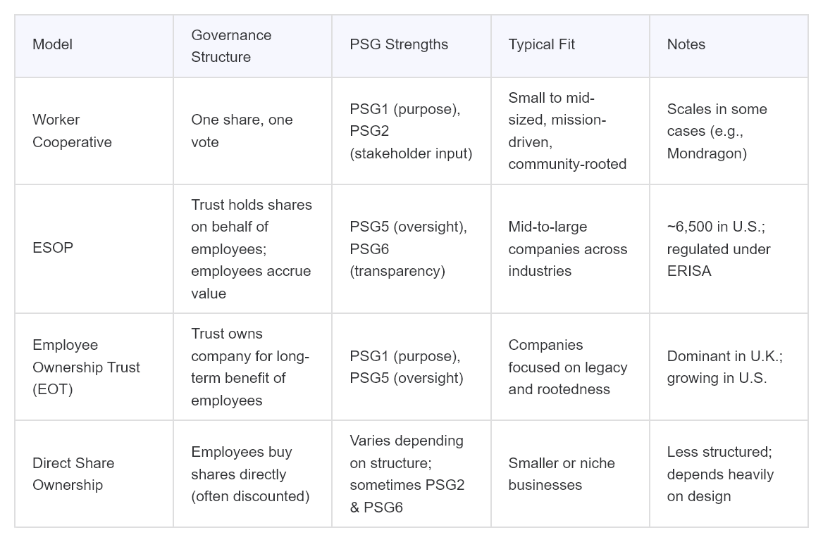 As Tim emphasizes, no single model fulfills every PSG requirement on its own. Worker co-ops excel in democratic governance, ESOPs in wealth-building and accountability, EOTs in purpose and stewardship, and direct share programs in flexibility. “There isn’t a silver bullet,” he explains. “But each model fulfills at least some of the standards, and often several, in significant ways.”