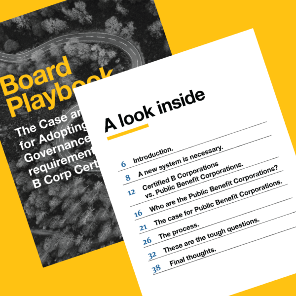 To help business leaders navigate the journey to adopt benefit corporation status as a requirement of B Corp Certification, B Lab U.S. & Canada provides this downloadable resource, the Board Playbook, to lay out the process and demystify the risks.